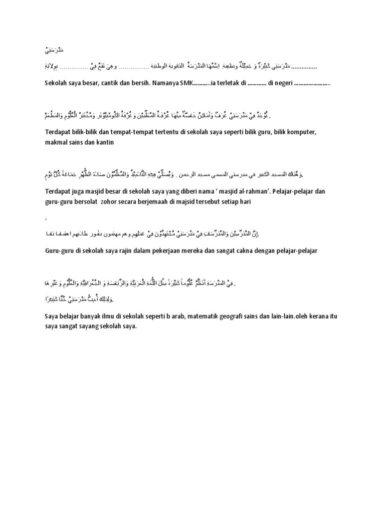 Karangan Penulisan Tahun 6 2013 Doc Pdf Document from reader017.vdokumen.net 20.para siswa di sekolah ا. Jikalau ada daripada anda di sini baik pelajar tingkatan satu, tingkatan dua, mahupun tingkatan 3 yang mahu dan berminat semak contoh karangan bahasa arab terbaik, mypt3 dengan berbesar hati ingin membantu anda. Pada kesempatan kali ini kita akan belajar tentang cerita bahasa arab dengan tema belanja ke pasar. Saya mengajar di smk al irsyad kota tegal, feel free to discuss tentang bahasa arab ya. Hi, assalamualaikum, perkenalkan, saya rohmat asli dari demak kota wali, saat ini saya tinggal di kota bahari bersama dengan istri dan buah hati. Karangan bahasa arab tentang menjenguk orang sakit. Pada postingan kali ini saya menulis tema kosakata bahasa arab tentang peralatan sekolah dan kelas beserta contoh kalimatnya. Saya ahmad, saya belajar di salah satu sekolah menengah islam, di sana saya banyak mempelajari mata pelajaran, seperti agama islam, ilmu alam, matematika, sejarah, geografi dsb.