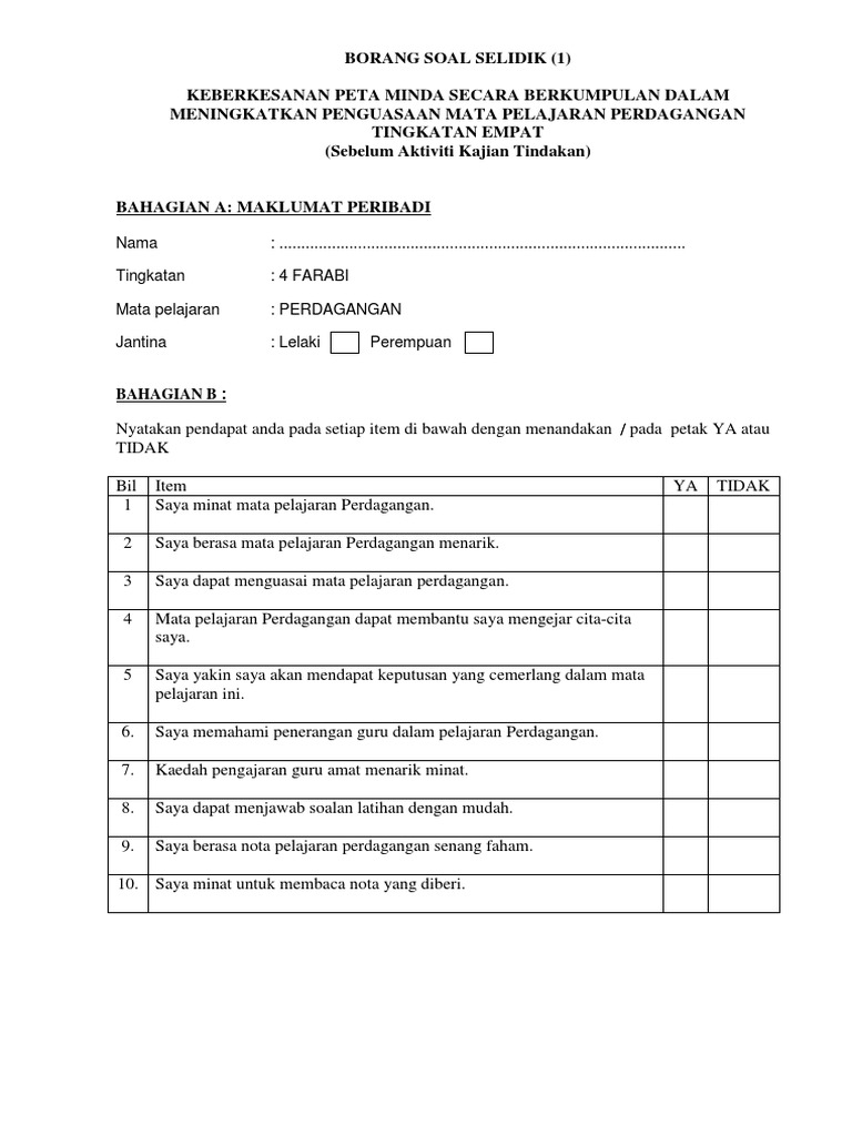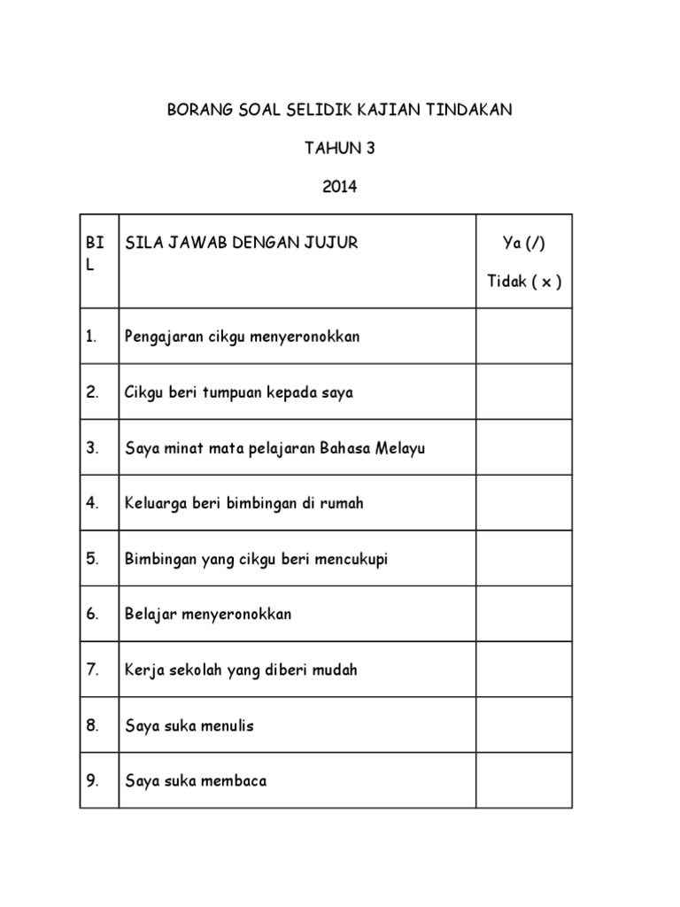 Soal Selidik Kajian Tindakan : Proses tindakan proses 1 merancang :. Pengumpulan data dalam kajian tindakan. Kajian tindakan berkaitan cara menyelesaikan sikap murid yang sukar menyiapkan kerja rumah. Sesuatu soal selidik dalam kajian tindakan boleh mempunyai 3 bahagian </b> </b> </b>. Proses 4 memerhati ( mengumpul bukti ) pengumpulan maklumat boleh dikumpul melalui pemerhatian, temubual, soal selidik, ujian dan latihan serta analisis dokumen. Soal selidik kajian impak sistem aduan integriti kementerian dalam negeri.