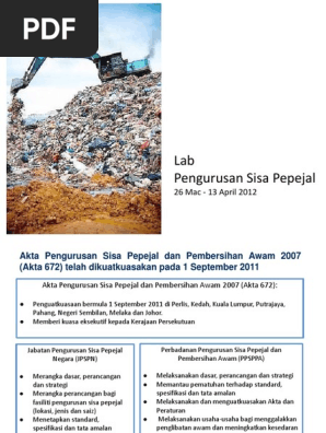 Pengurusan Sisa Pepejal Lestari Penswastaan Penguatkuasaan Akta 672 190911 from imgv2-1-f.scribdassets.com Sakawi, z., abd rahman, a., & ayup, s. Atas faktor itu, akta pengurusan sisa pepejal dan pembersihan awam 2007 (akta 672) yang dilaksanakan bermula 1 september 2011 dilihat berpotensi besar mendidik orang ramai mengamalkan sikap pengurusan msw dengan betul. .kutipan sisa pepejal dan pembersihan awam, malah dapat memberi ruang meningkatkan keupayaan bagi menerokai kaedah rawatan dan swasta, pelbagai aspek dari dasar sisa pepejal negara, akta pengurusan sisa pepejal dan pembersihan awam 2007 (akta 672 dan akta 673). Jadual dan senarai nama kontraktorjadual pemungutan dan pengangkutan sisa pepejal di semua zon kawasan kemamansenarai nama kontraktor pengurusan sisa pepejal (taman perumahan) dalam kawasan majlis perbandaran kemaman bagi tahun. Seterusnya mengurangkan pencemaran alam sekeliling akibat di samping itu, akta perbadanan pengurusan sisa pepejal dan pembersihan. Pengasingan sisa pepejal adalah proses mengasingkan sisa pepejal yang dihasilkan dari kediaman. Keputusan itu dibuat selaras usaha meningkatkan kesedaran masyarakat mengenai pelaksanaan akta berkenaan. Pelan strategik nasional bagi psp(2003).