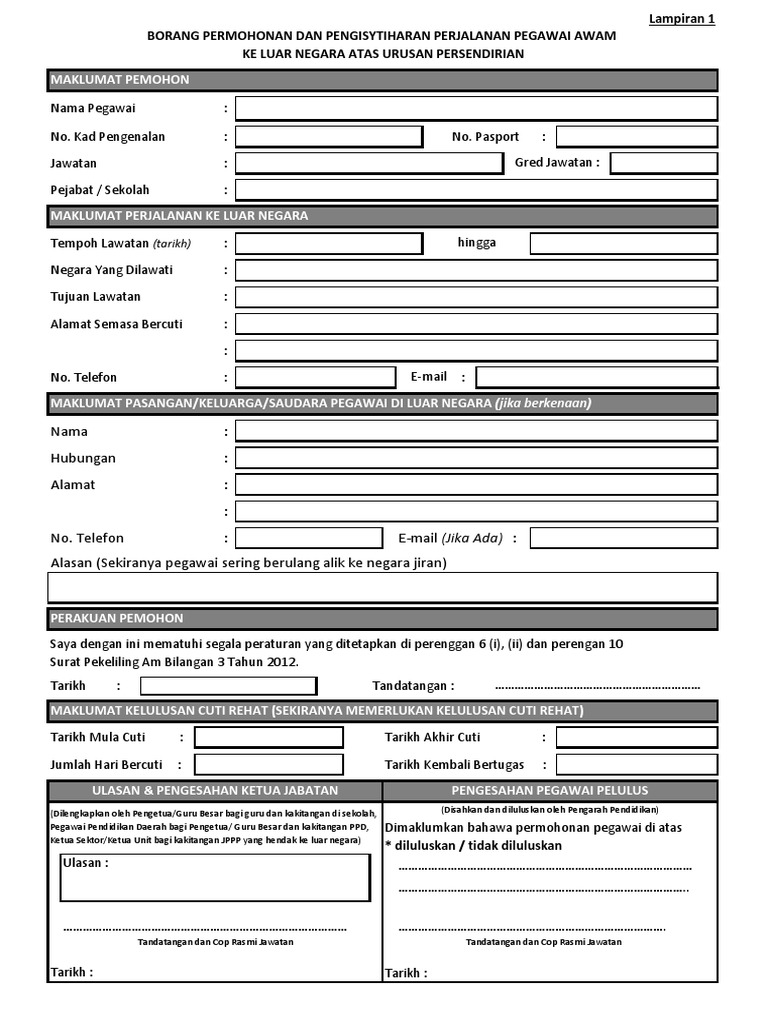 Sila asingkan permohonan tugas rasmi ke luar negara serta cuti rehat ke luar negara jika dilakukan pada masa yang sama. Borang permohonan perjalanan ke luar negara: Lampiran 1 permohonan perjalanan pegawai awam ke luar negara atas urusan persendirian maklumat pemohon nama pegawai : Perakuan pemohon saya dengan ini mematuhi segala peraturan yang ditetapkan di dalam surat pekeliling am bsm bil.2/2018, sppm bil.2/2017, sppm bil.13/2013 dan surat edaran bsm 155/183/354/404. Hingga negara yang dilawati :