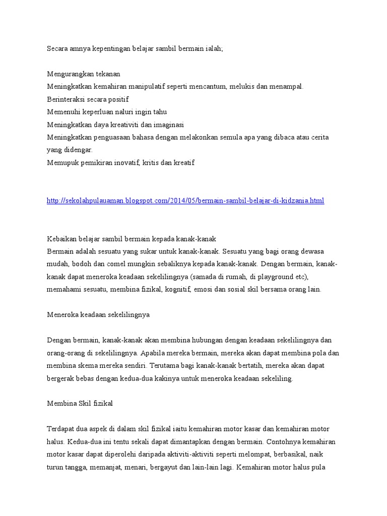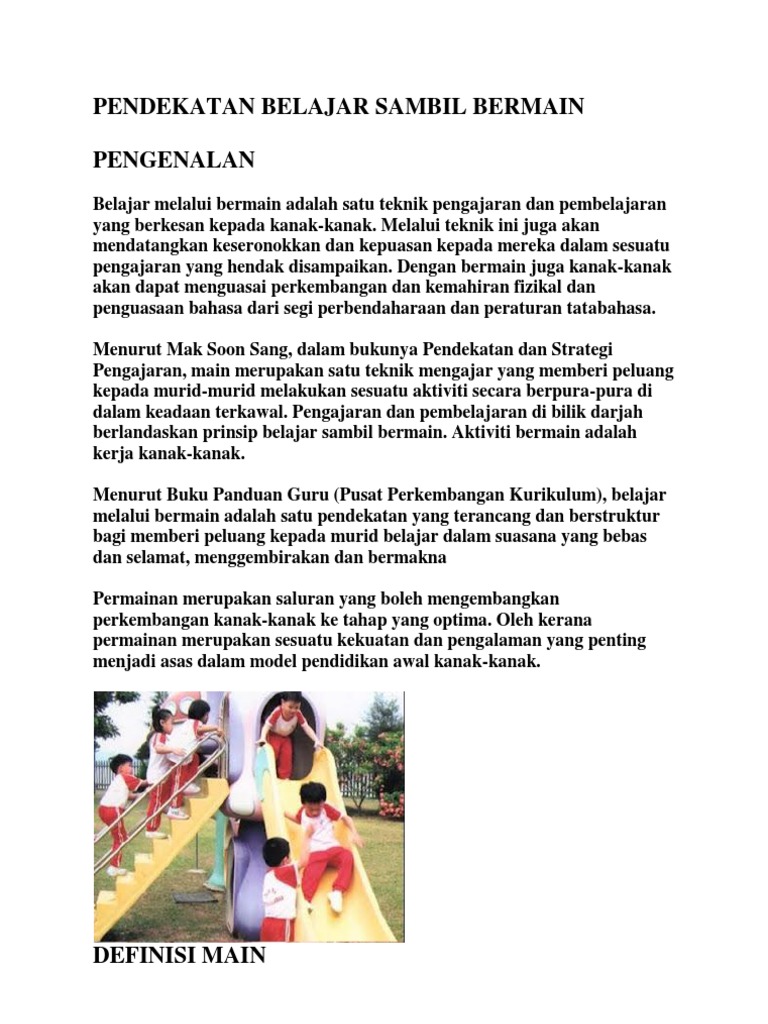 Permainan yang akan dilakukan harus direncanakan agar dapat membawa anak kepada situasi yang merangsang pertumbuhan dan. Konten bermain dalam belajar menyediakan beragam kesempatan bagi pembelajar muda (young children). Atau, pengertian belajar itu hanya menekankan pada kegiatan di kelas? Kaedah bermain adalah kaedah pembelajaran yang mendekatkan diri pelajar kepada pengalaman sebenar secara langsung, terutama apabila mengajar konsep atau kemahiran. 0 ratings0% found this document useful (0 votes).